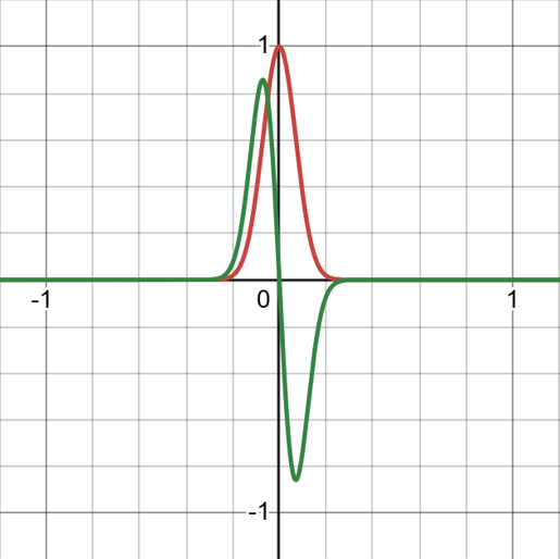 \begin{equation} \begin{aligned} \phi'(x) &= \\ \int_{\mathbb{R}^n} \delta(y - x) \phi'(x) \ dy &= \\ \int_{\mathbb{R}^n} \delta(y) \phi'(x - y) \ dy &= \\ -\int_{\mathbb{R}^n} \phi(x-y) \frac{d}{dy}[\lim_{\alpha \rightarrow 0} \frac{e^{-(y/\alpha)^2}}{|\alpha| \sqrt{\pi}}] \ dy \end{aligned} \end{equation}where we used integration by parts and the assumption that \(\phi\) is nonzero only on a bounded area in \(\mathbb{R}^n\) (compact support) to ensure the disappearance of any boundary terms (since differentiation is local we could replace \(\phi\) by a function identical to it on a small area around \(x\) anyway if need be to obtain a similar expansion). We used the limit \(\delta(y) = \lim_{\alpha\rightarrow 0} \frac{e^{(y/\alpha)^2}}{|\alpha| \sqrt{\pi}}\), representing the Dirac-δ as a limit of Gaussian bell curves with \(0\) variance. We can figure out that the finite difference operator would look like it does from the fact that the bell curve with near \(0\) variance looks like a big positive spike (similar to another approximate δ function) at the left inflection point and symmetrically a negative spike at the right inflection point and an odd (as in antisymmetric, an odd function) curve from the left inflection point to the right (for a more rigorous derivation: use the trapezoidal rule and some approximations that work for small \(\alpha\)), so we should expect to see it picking out the left neighbor value negatively, taking nothing near the center (due to the odd integrand there), and then picking out the right hand value positively. If you work through the approximation more rigorously, you'll recover the finite difference expression. I included a picture of the derivative as a visual aid. The conclusion is just that convolutions reproduce a lot of different useful operators because a lot of different useful operators are translation invariant, which probably occurs so much because the laws of nature are invariant with respect to space and a mean-value approximation often suffices for variations in many quantities. I think that also emphasizes the limitation of convolutions in and of themselves though.